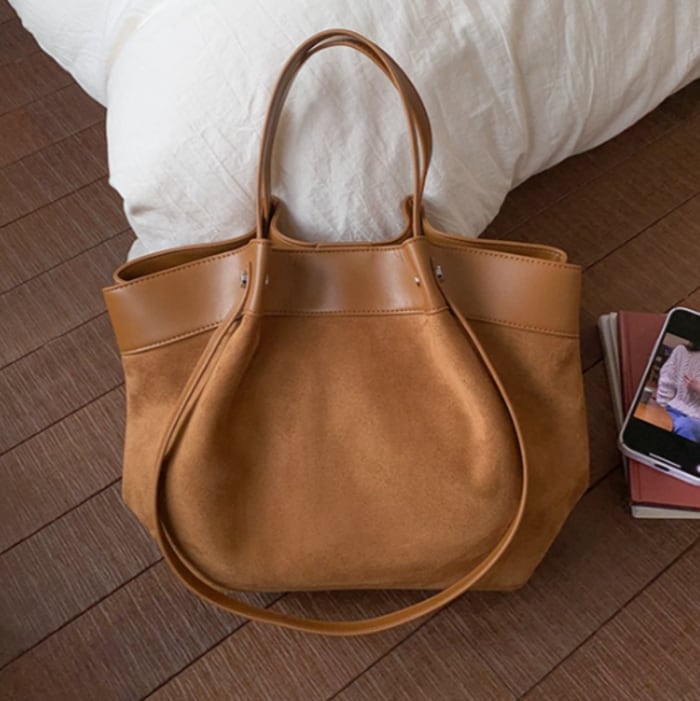 スエード調素材とフェイクレザーの異素材コンビが、しっとり落ち着いた季節感を添えるトートバッグ。