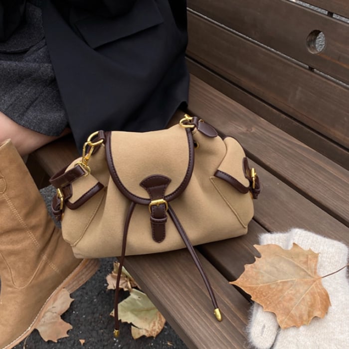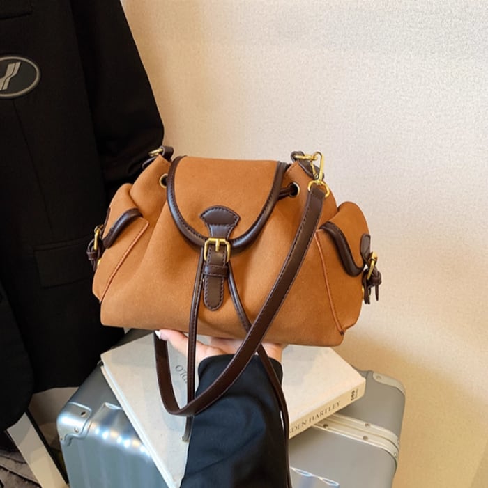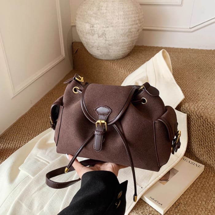 スエード調の素材にダークブラウンのレザー風パーツとゴールドの金具を合わせて、秋冬らしい落ち着きと上品さを演出。