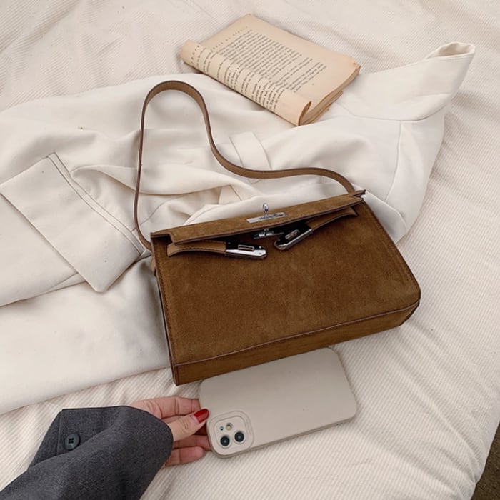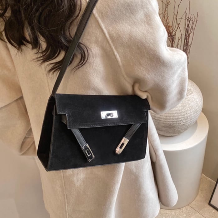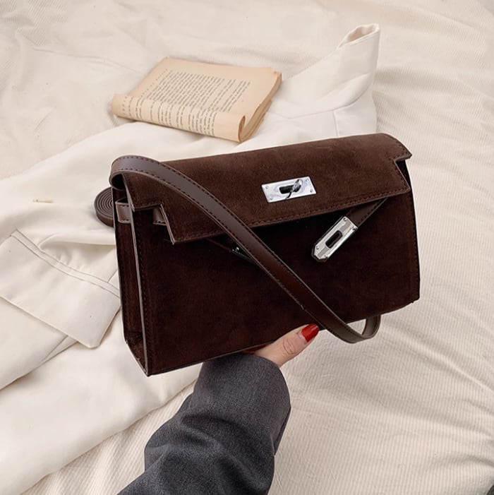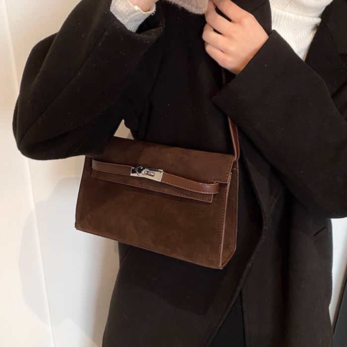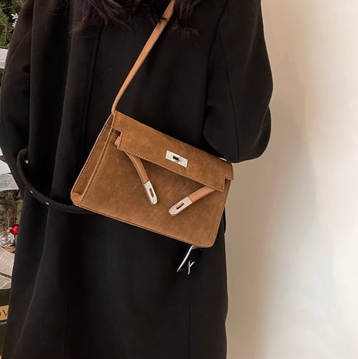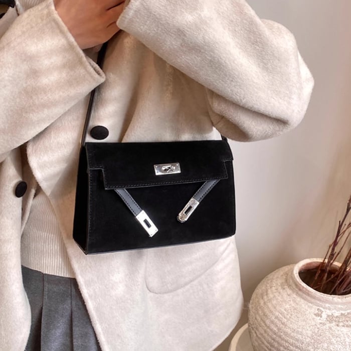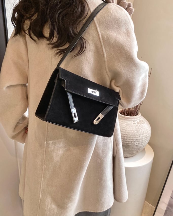 上品なスエードライク素材で仕上げた、クラシックな佇まいのフラップバッグ。