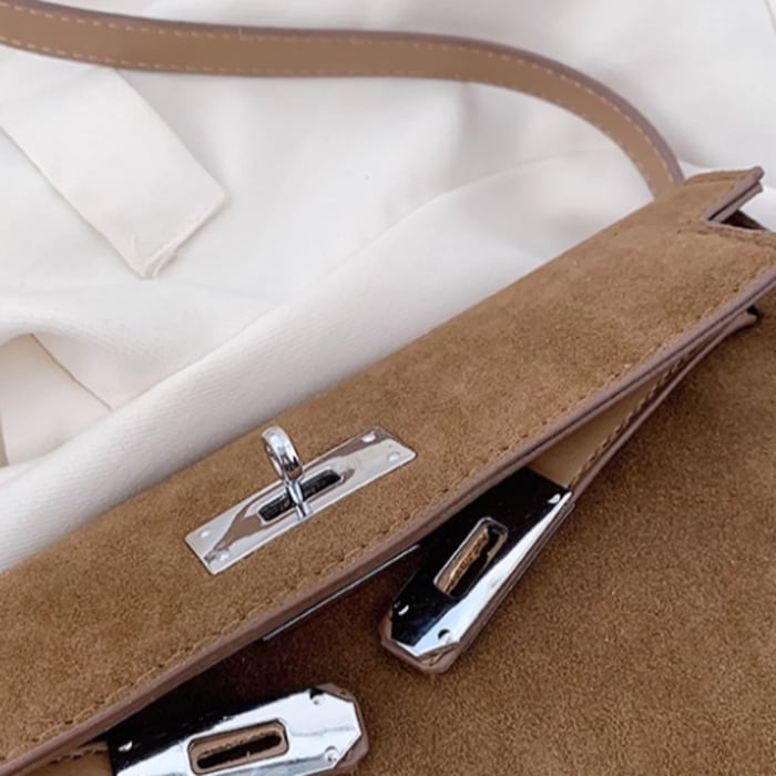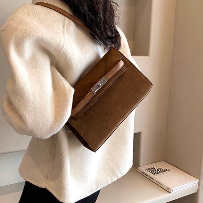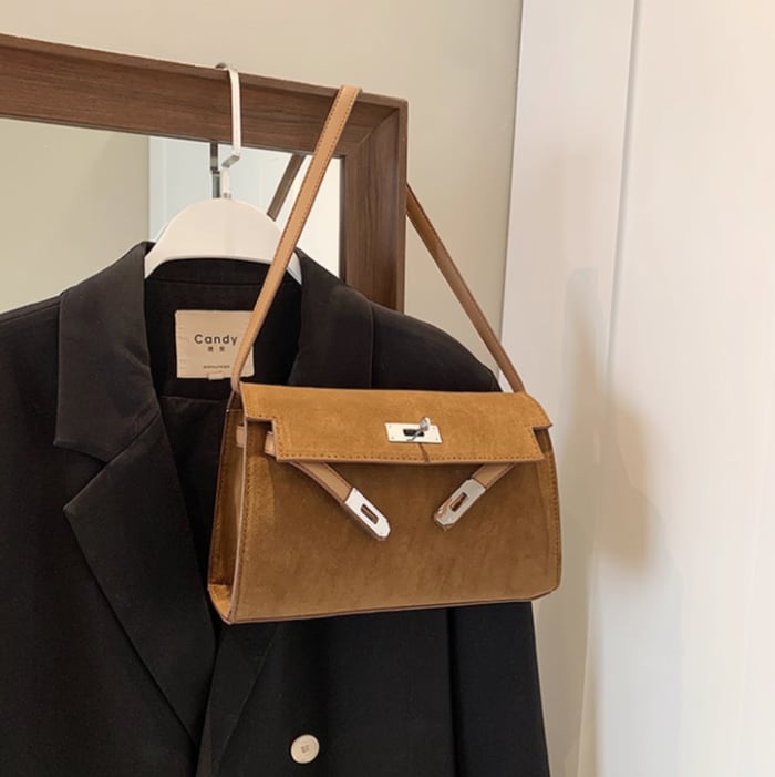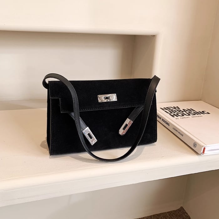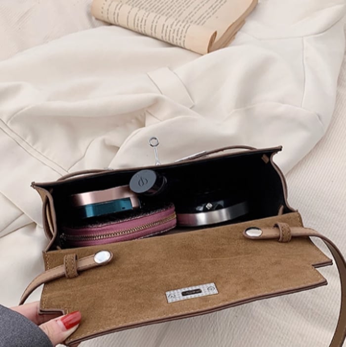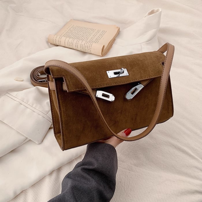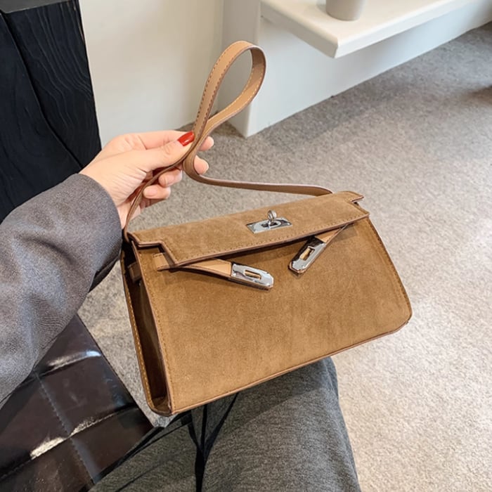 上品なスエードライク素材で仕上げた、クラシックな佇まいのフラップバッグ。