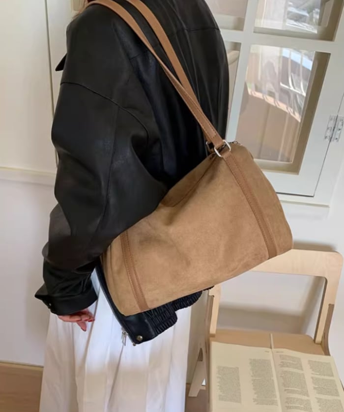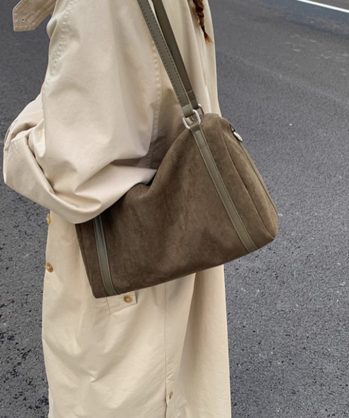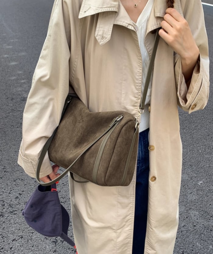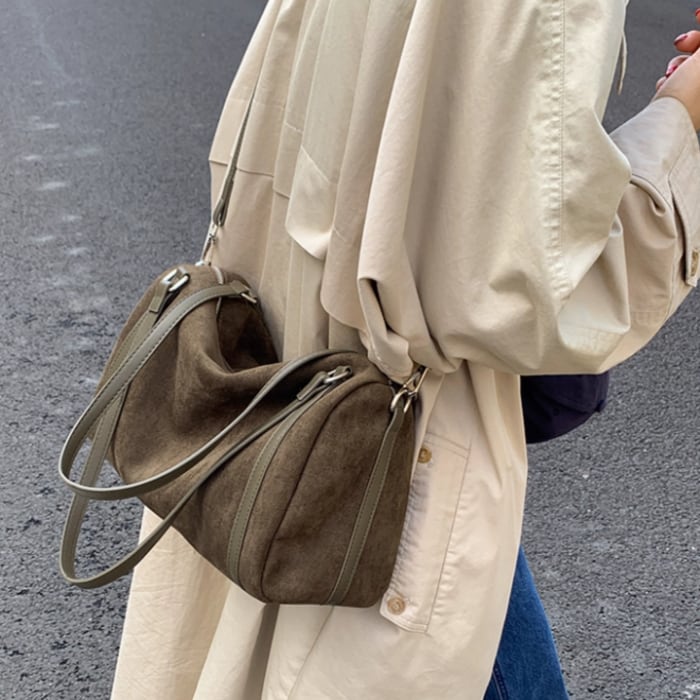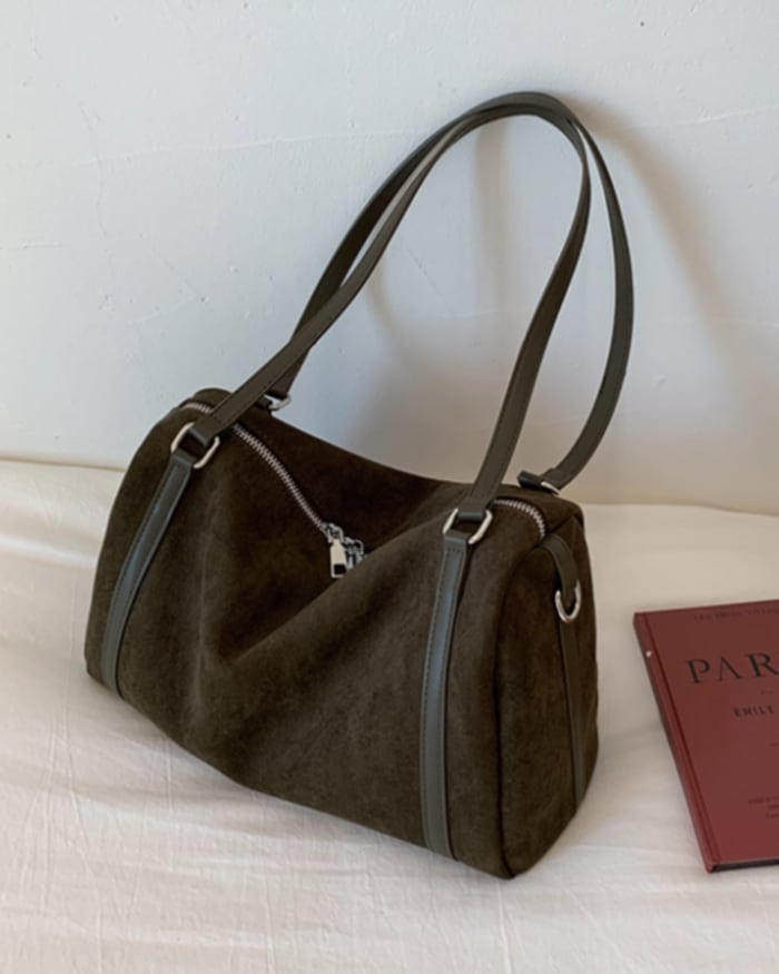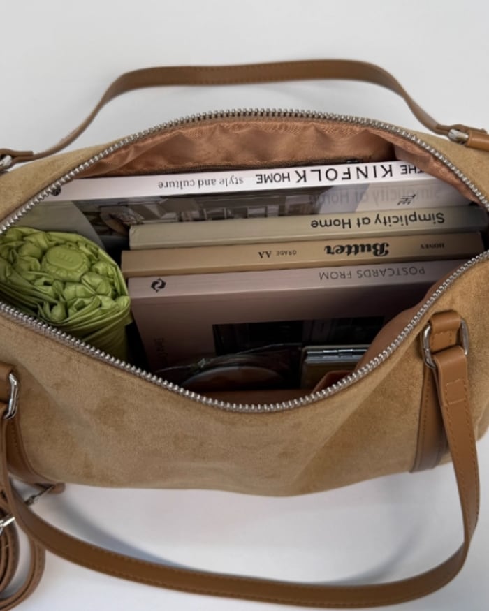 スエードライク素材のやわらかな風合いと、サイドに入ったライン切り替えのアクセントが魅力のボストンバッグ。