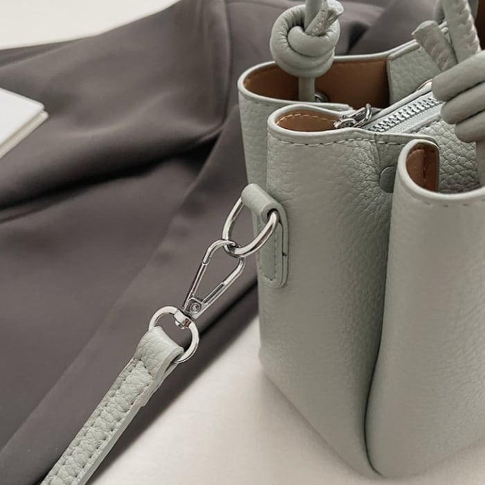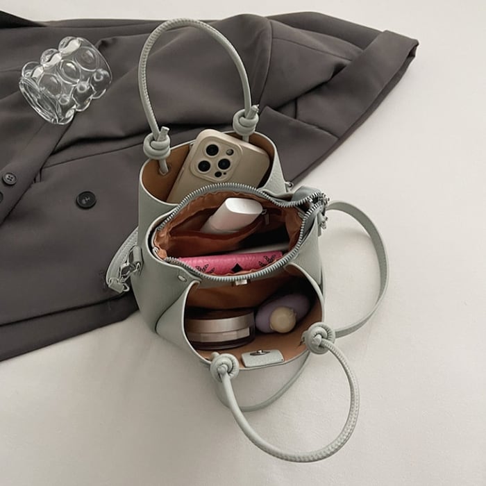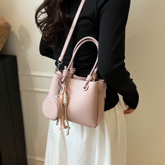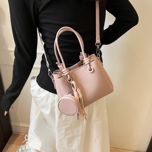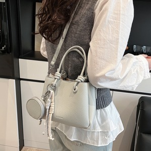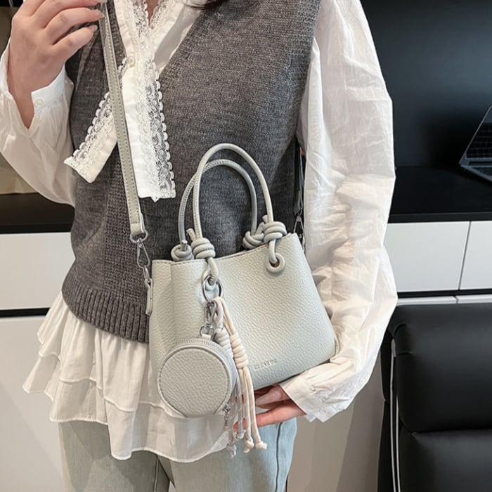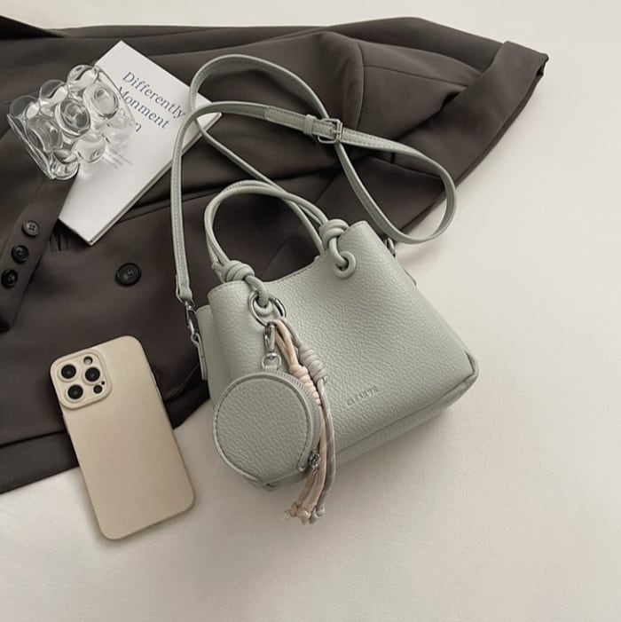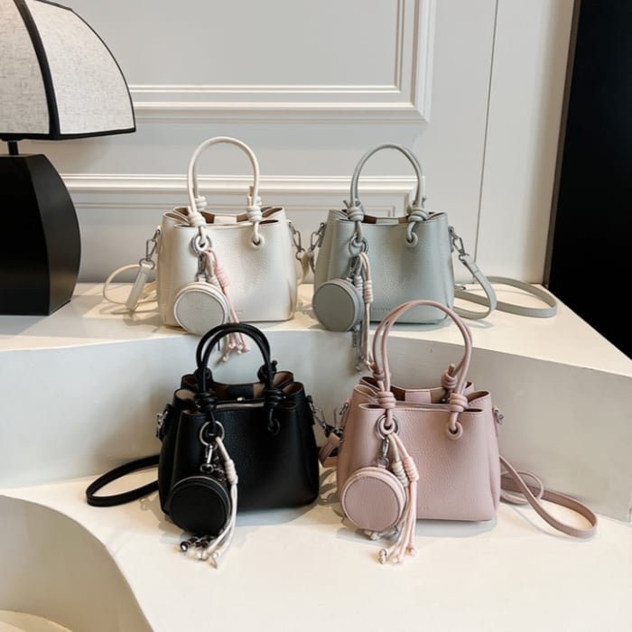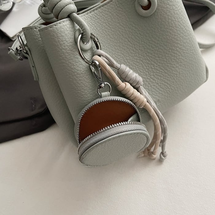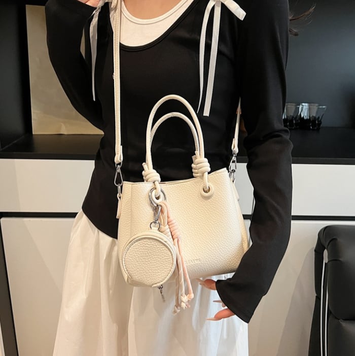 結びデザインのハンドルや丸型ポーチチャームがアクセントになり、コーデにさりげない遊び心を添えてくれます。