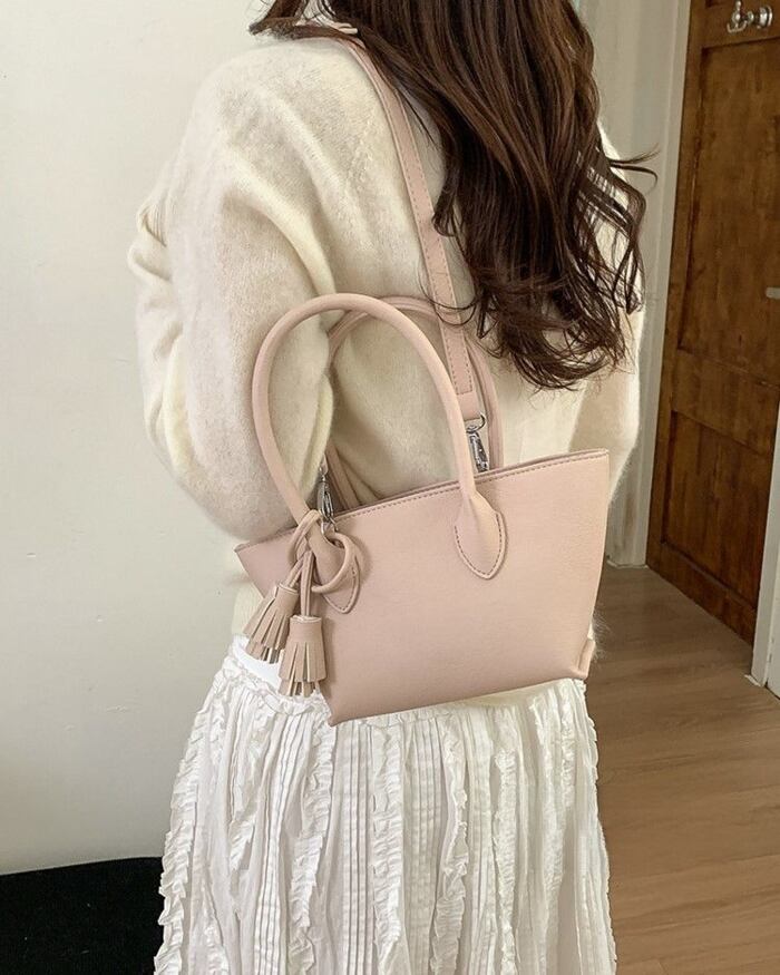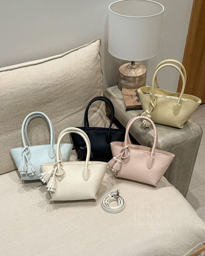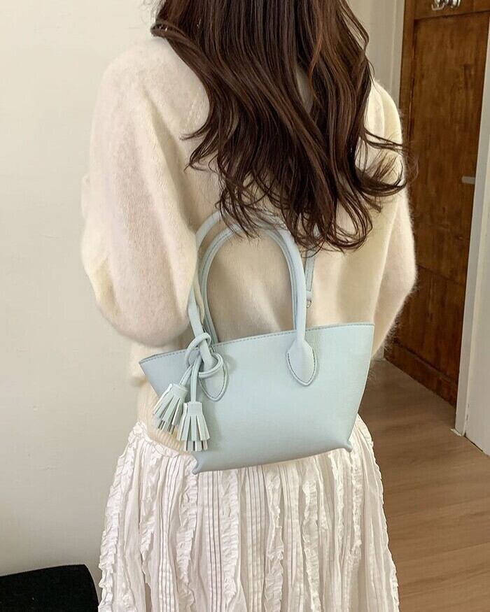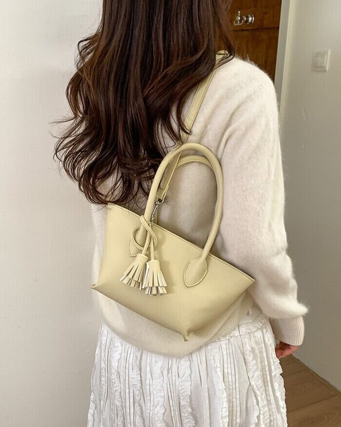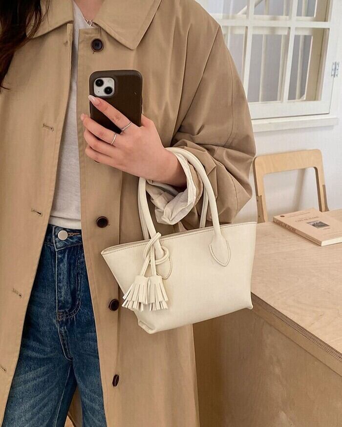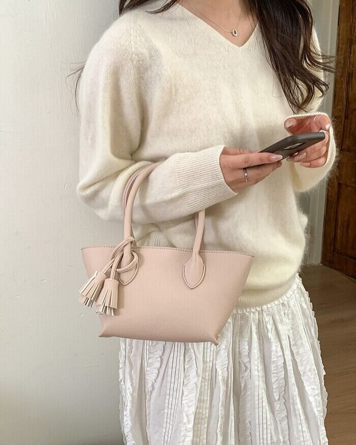 フロントにあしらわれたフリンジチャームが目を惹くミニトートバッグ。