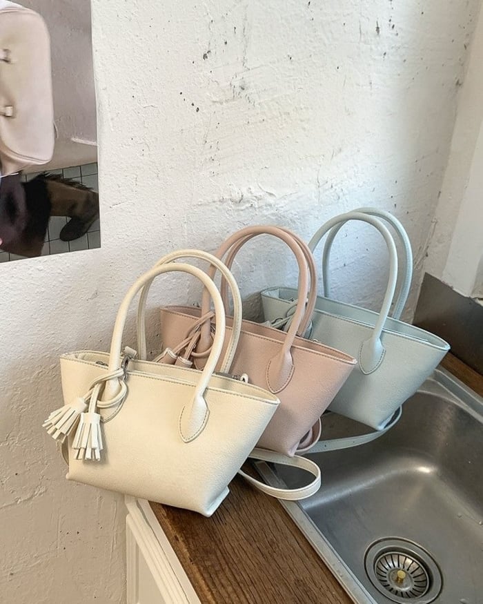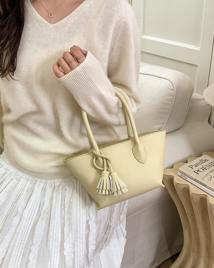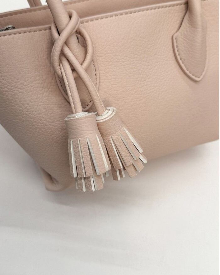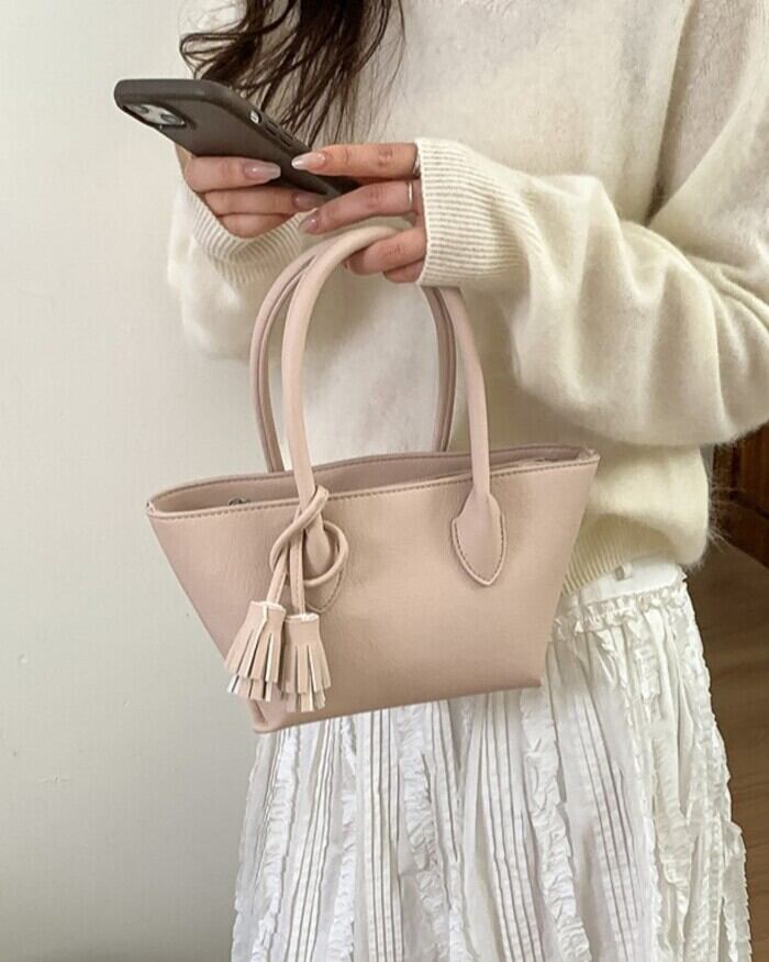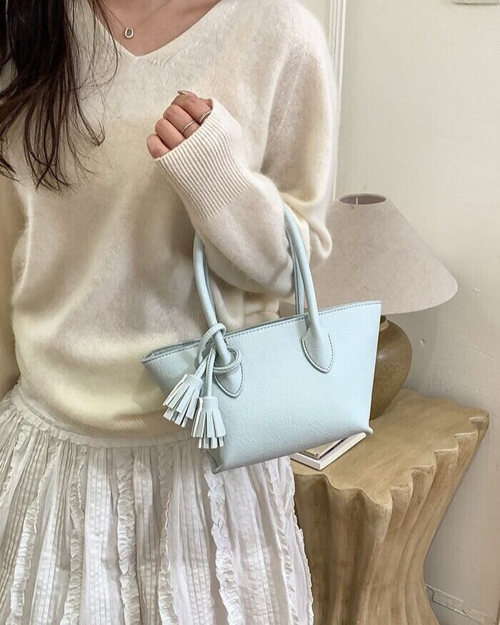 フロントにあしらわれたフリンジチャームが目を惹くミニトートバッグ。