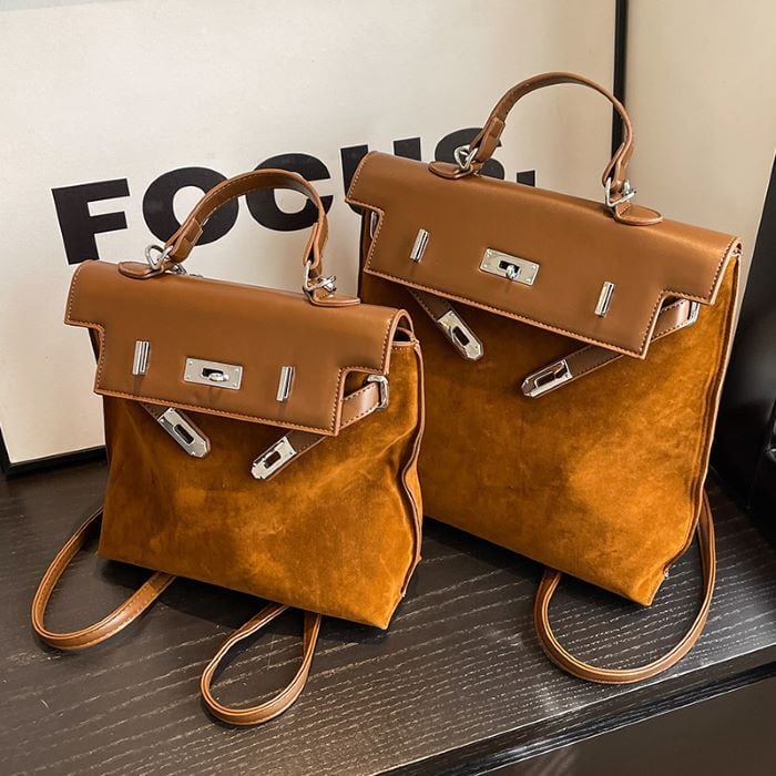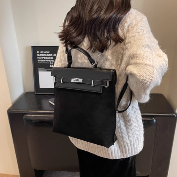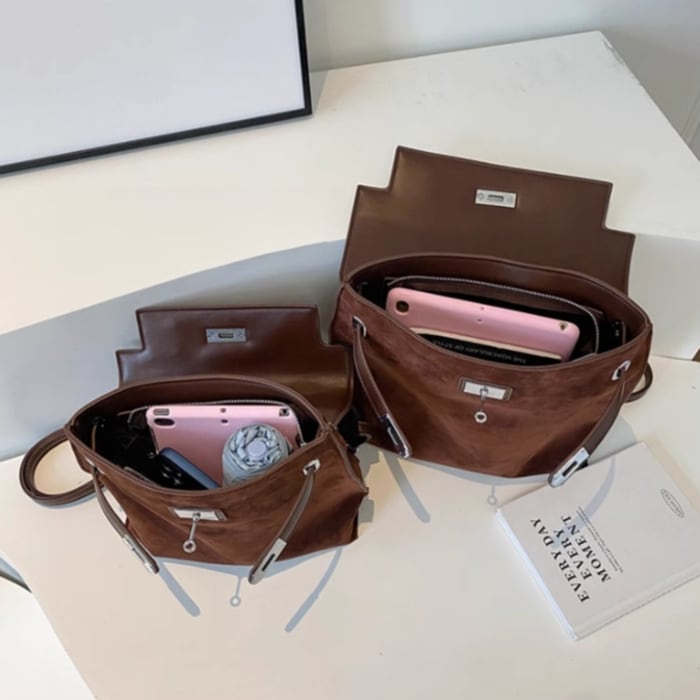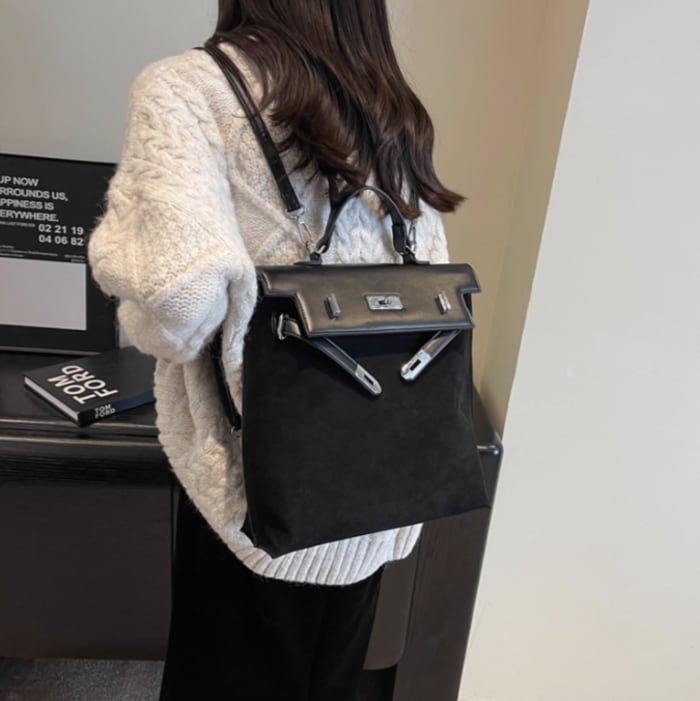スエード調とPUの異素材ミックスが立体感を演出し、コーディネートに洗練された印象を与えてくれます。