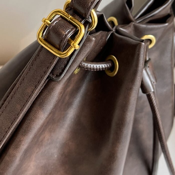 ヴィンテージライクな光沢のあるフェイクレザーが、カジュアルながらも上品な印象を与える2WAYバッグ。